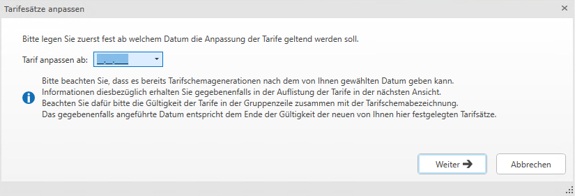 Nachdem Sie Tarifsätze anpassen gewählt haben, müssen Sie zuerst eingeben, ab welchem Datum die neuen Tarifsätze gelten. Mit diesem Datum wird in den jeweiligen Tarifschemata eine neue Generation angelegt.