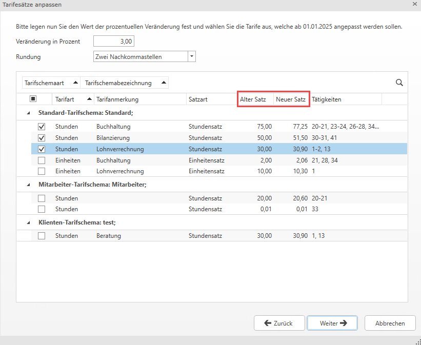 Mit der Schaltfläche Weiter erhalten Sie eine Liste aller angelegten Tarife. Hier können Sie nun die Veränderung in Prozent inkl. der Rundung definieren sowie jene Tarife auswählen, welche angepasst werden sollen.