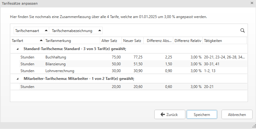 Mit der Schaltfläche Tarifsätze anpassen können nur fixe Stunden- oder Einheitensätze sowie wertmäßige Änderungen angepasst werden. Arbeiten Sie in den Mitarbeiter- und Kliententarifschemata mit prozentuellen Abweichungen, müssen die Prozentsätze im jeweiligen Tarifschema extra angepasst werden.