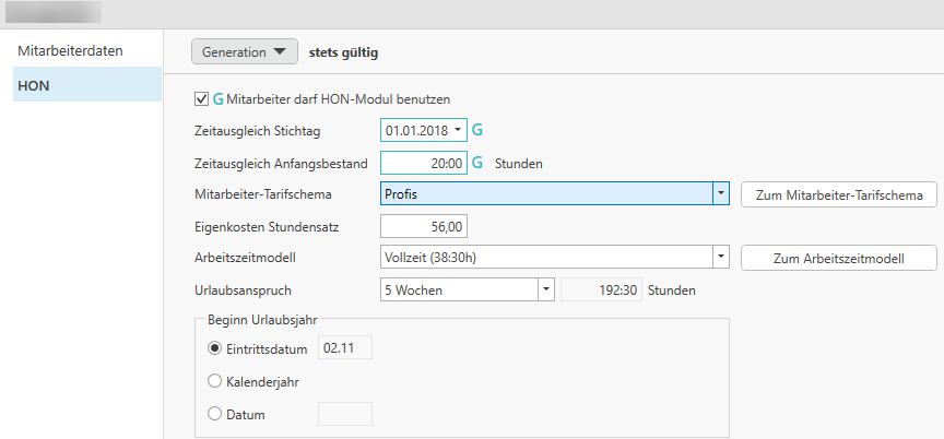 Mithilfe der Schaltflächen zum Mitarbeiter-Tarifschema / zum Arbeitszeitmodell / zum Klienten-Tarifschema gelangen Sie in die Stammdaten der Honorarverrechnung. Es wird automatisch die jeweilige Ansicht der HON-Stammdaten geöffnet. Sie können bestehende Stammdaten bearbeiten oder neue definieren.