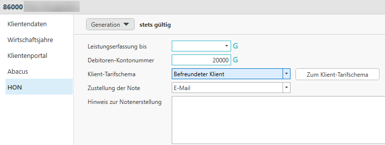 Im Klientenstammdaten-Bereich haben Sie die HON-Einstellungen zur Auswahl. Sie haben im Bereich HON beim Klienten-Tarifschema nun die Möglichkeit, ein abweichendes Tarifschema für den gewählten Klienten zu hinterlegen.