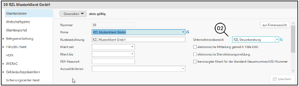 Dieser Eingabebereich ist nur aktiv, wenn mehrere Unternehmensbereiche angelegt wurden. Ist dies der Fall, dann ist in den Stammdaten der Mitarbeiter im Reiter Mitarbeiterdaten festzulegen, für welchen Unternehmensbereich dieser Mitarbeiter tätig ist (1). Weiters ist in den Stammdaten des Klienten im Reiter Klientendaten festzulegen, welchem Unternehmensbereich der Klient angehört (2).