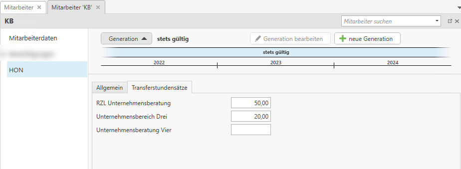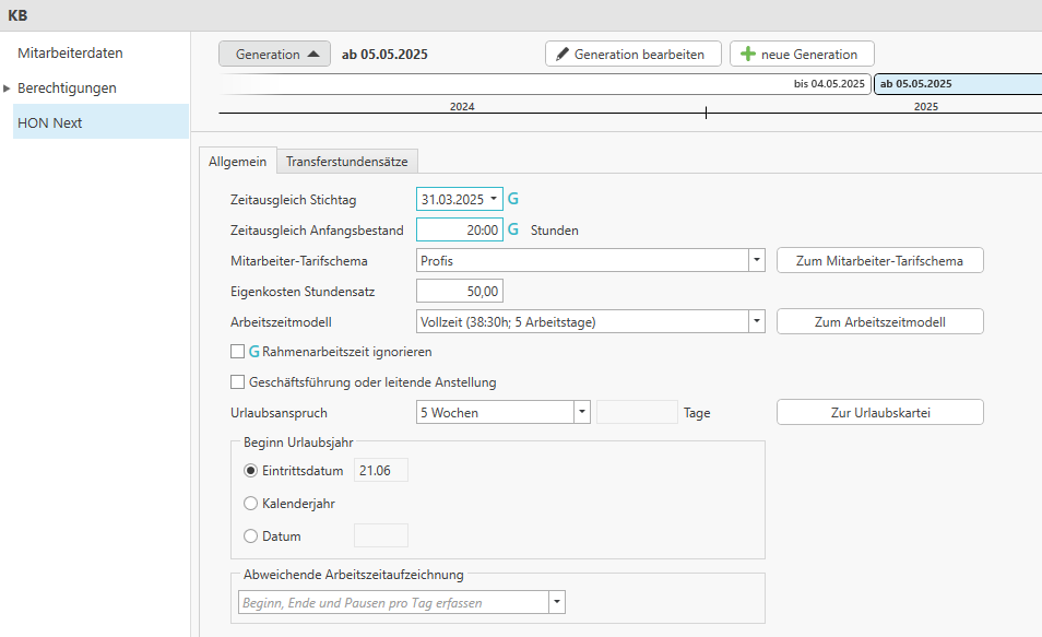 Die HON-Mitarbeiterstammdaten sind generationsverwaltet. Falls eine Änderung ab einem bestimmten Zeitpunkt gelten soll, so ist eine neue Generation anzulegen.