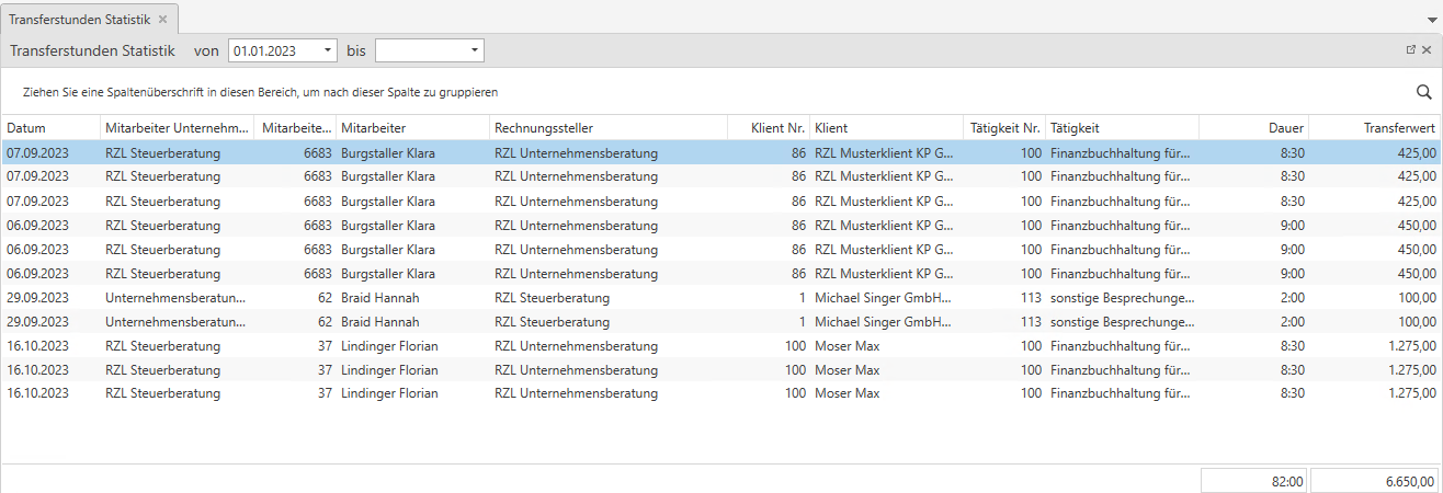 Die Spalte Transferwert wird aufgrund der erfassten Dauer mal dem hinterlegten Transferstundensatz beim Mitarbeiter ermittelt.
