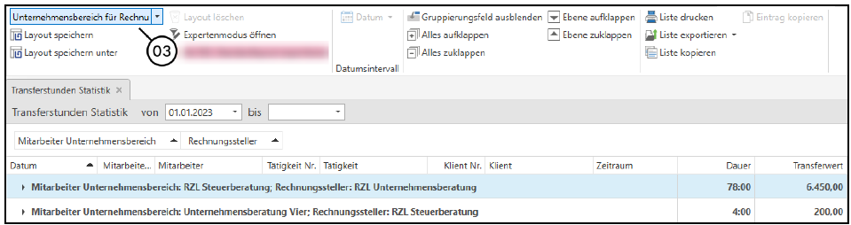 In der Transferstunden-Statistik steht Ihnen das RZL-Layout Unternehmensbereich für Rechnungssteller zur Verfügung (3). Diese Auswertung zeigt Ihnen auf einen Blick, wie viel Dauer/Wert der jeweilige Mitarbeiter-Unternehmensbereich für einen Rechnungssteller erfasst wurde.