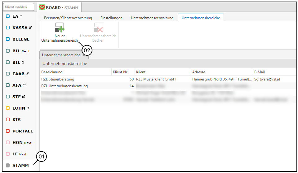 Ihre Unternehmensbereiche befinden sich im Board unter der Rubrik Stamm (1) – Unternehmensverwaltung – Unternehmensbereiche. Wurde dieser Punkt von Ihnen ausgewählt, so öffnet sich ein eigener Tab für die Unternehmensbereiche.