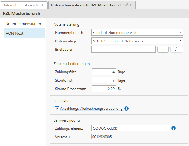 Im Bereich HON können Sie für den Unternehmensbereich den zugehörigen Nummernbereich (siehe Kapitel Nummernbereich), die zugehörige Notenvorlage und die Zahlungsbedingungen hinterlegen. Ebenso ist die Hinterlegung eines PDF-Briefpapiers möglich. Bei Briefpapier ist der Pfad, wo das Briefpapier abgespeichert ist, zu definieren.