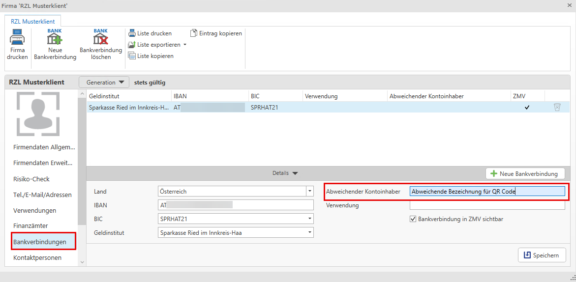 Als Kontoinhaber wird initial der Personen- oder Firmenname verwendet - siehe Feld Firma/Person. Wird jedoch eine andere Kontobezeichnung für die Überweisung mittels QR-Code benötigt, kann über den Shortcut zur Personen-/ Firmenansicht im Reiter Bankverbindung ein abweichender Kontoinhaber definiert werden (max. 70 Zeichen lt. xml-Struktur).