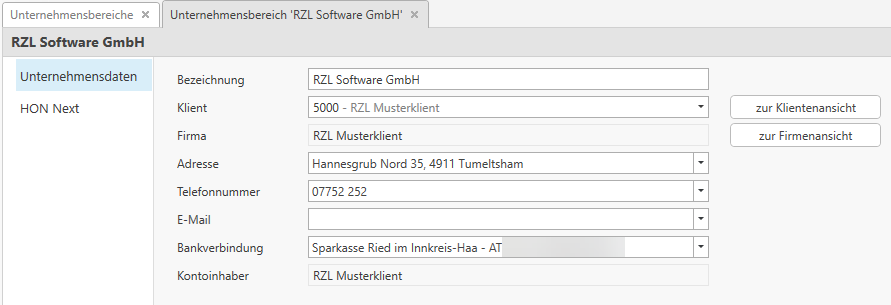 Bei der Neuanlage eines Unternehmensbereichs müssen Sie die Bezeichnung des Unternehmensbereichs und die Klienten-Zuordnung entsprechend treffen. Des Weiteren können die Adresse, Telefonnummer, E-Mail-Adresse und Bankverbindung hinterlegt werden. Über den Button zur Klientenansicht gelangen Sie in die Stammdaten des Klienten und über den Button zur Firmenansicht gelangen Sie zur Firmenansicht.