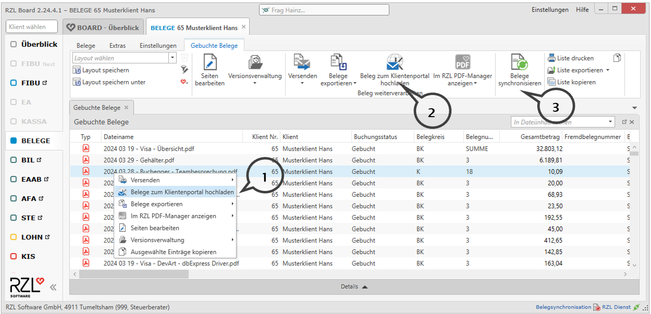 Die Schaltfläche Belege synchronisieren (3) lädt alle Belege in der Liste hoch. Sie können die Belegsynchronisation in den Stammdaten des Klienten im Bereich Belegverarbeitung automatisieren.