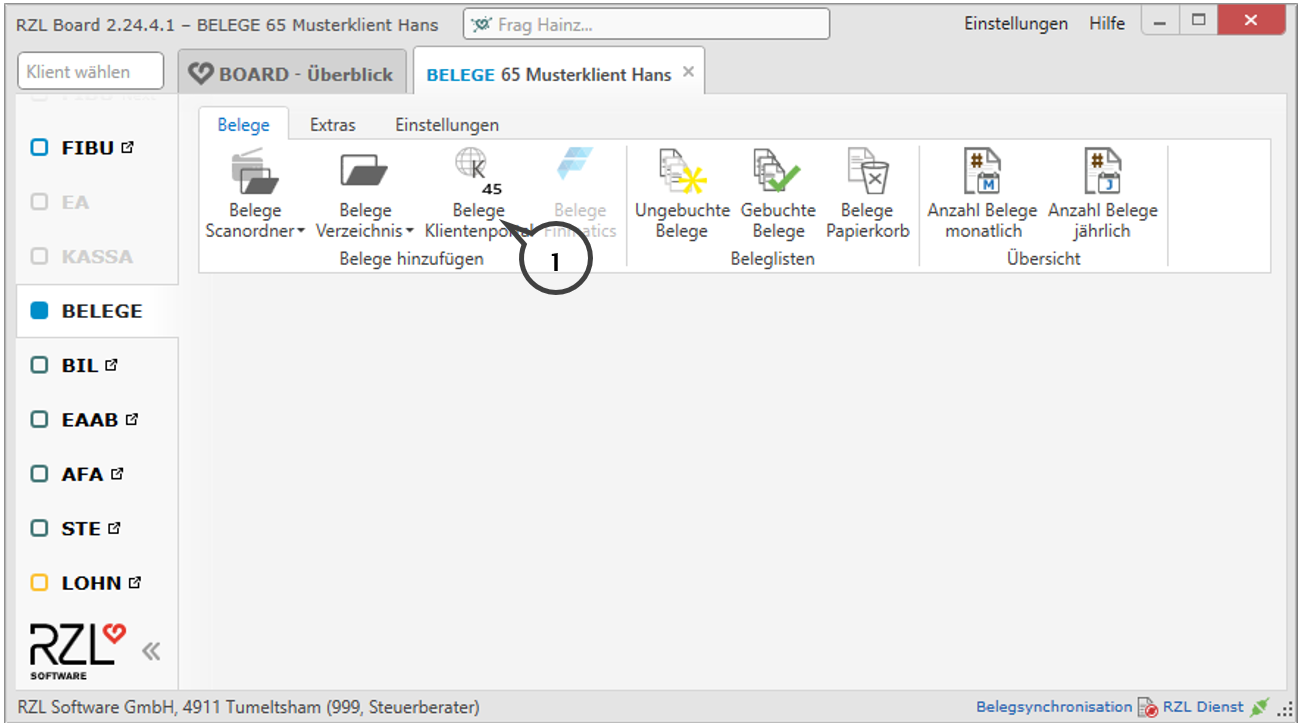 Die Belege werden im Board durch Anwahl des Schaltfläche Belege Klientenportal (1) heruntergeladen und können weiterbearbeitet bzw. übernommen werden.