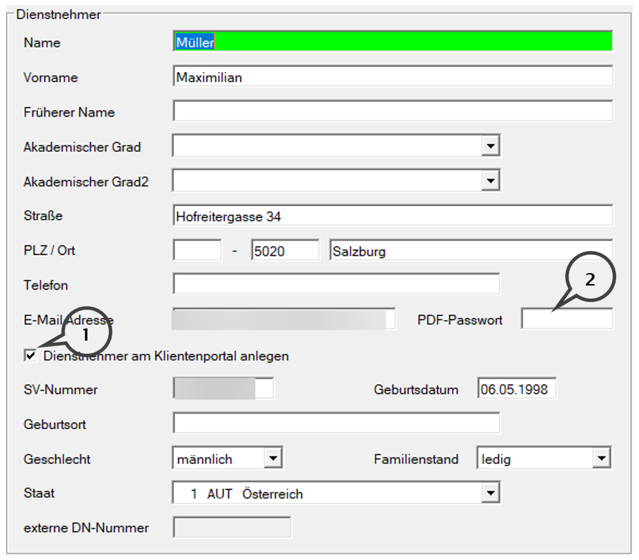 Das Feld E-Mail Adresse muss ausgefüllt und die Option Dienstnehmer am Klientenportal anlegen (1) muss aktiviert werden.
