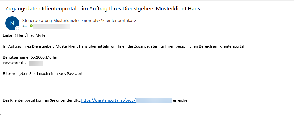 Wenn die Daten aus der RZL Lohnverrechnung ins RZL Klientenportal hochgeladen werden, erhalten die Dienstnehmer automatisch eine Mail mit den automatisch generierten Zugangsdaten. Der Benutzername besteht aus der Klientennummer, der Dienstnehmernummer und dem Nachnamen des Dienstnehmers. Das Passwort wird von RZL zufällig generiert.