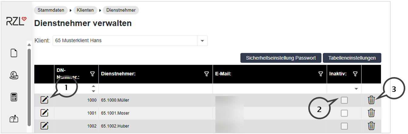 Inaktive Dienstnehmer können durch Anwahl des Papierkorbs innerhalb des Portals (3) endgültig gelöscht werden. Beim Löschen eines Dienstnehmers werden auch alle am RZL Klientenportal bereitgestellten Dokumente gelöscht. Wird ein aktiver Dienstnehmer ohne Austrittsdatum gelöscht, wird dieser mit der nächsten Datenbereitstellung des Lohnprogramms wieder ins RZL Klientenportal übernommen.
