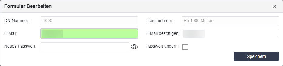 Innerhalb der Detaildaten können die E-Mail-Adresse und das Passwort bearbeitet werden. Wird das Feld Passwort ändern angewählt, wird ein Email mit dem neuen Passwort an den Dienstnehmer gesendet und es muss der Dienstnehmer beim nächsten Einstieg in das RZL Klientenportal das Passwort ändern.