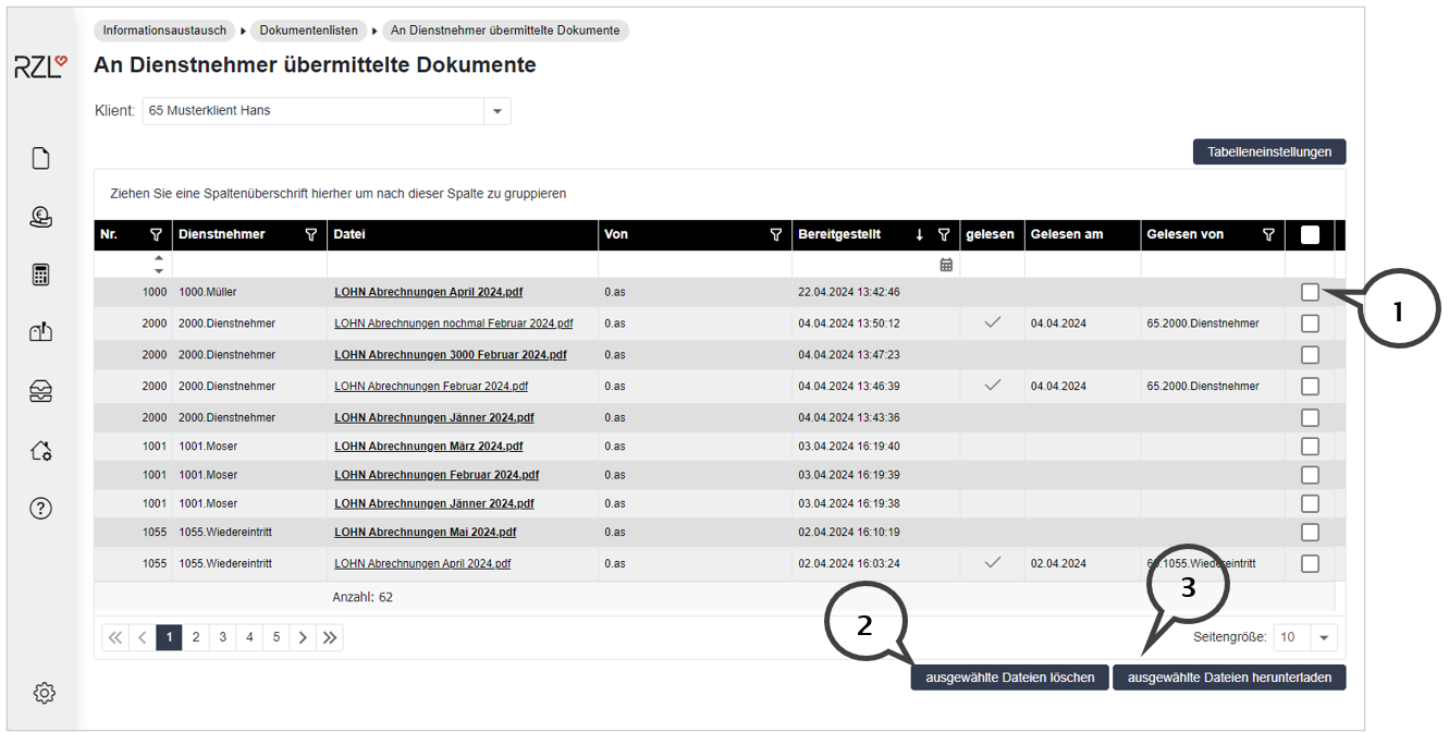 Durch Anwahl des Kästchens (1) und den Schaltflächen unterhalb der Übersicht kann das Dokument entweder gelöscht (2) oder heruntergeladen (3) werden.