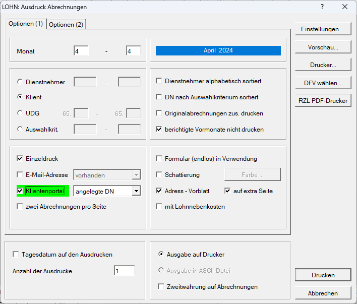 Innerhalb des Lohnverrechnungsprogramms müssen Sie im Programmteil Ausdruck / Abrechnungen die Felder Einzeldruck und Klientenportal mit der Option angelegte DN aktivieren.