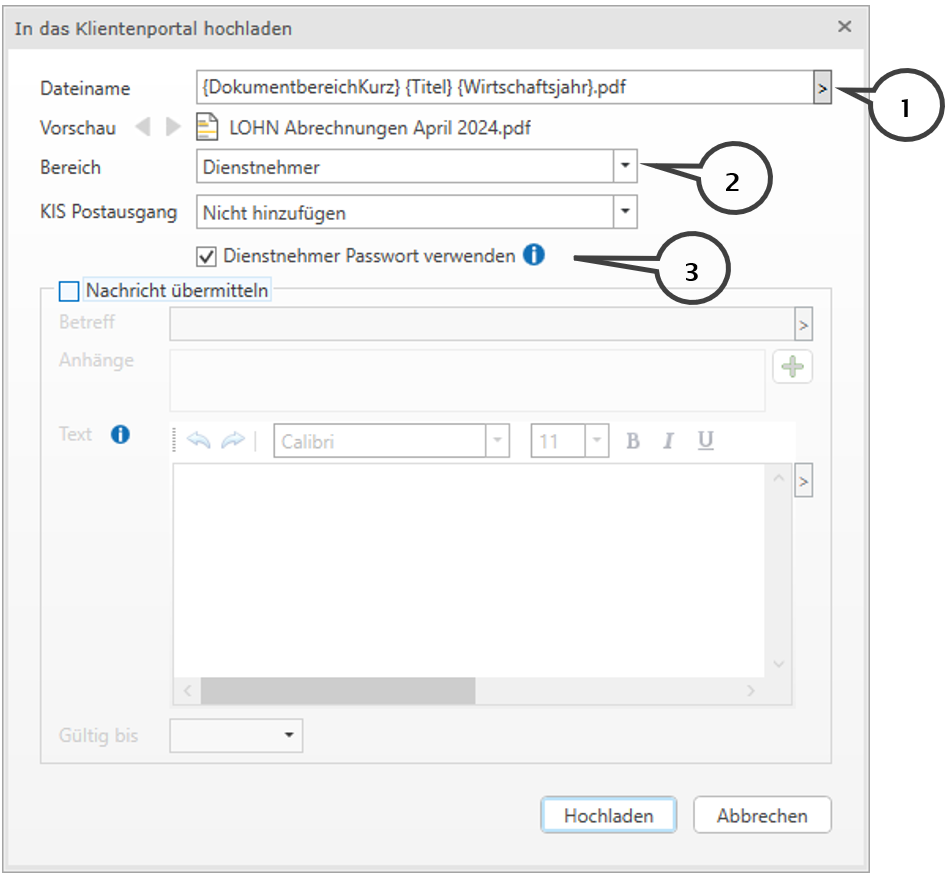 Mit der Option Dienstnehmer Passwort verwenden (3) wird das beim Dienstnehmer in der Lohnverrechnung hinterlegte PDF-Passwort gesetzt. Sie können den Dienstnehmern Nachrichten übermitteln. Aktivieren Sie dazu die Option Nachricht übermitteln.