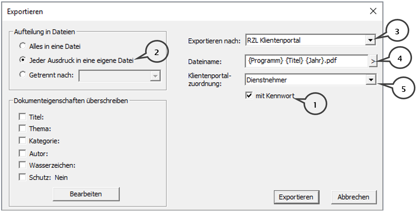 Im Feld Exportieren nach (3) muss der Eintrag RZL Klientenportal angewählt werden.