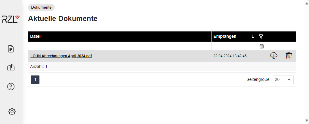 Durch einen Klick auf die Datei öffnet sich die Abrechnung und kann ausgedruckt werden. Durch Anwahl des Download Symbols kann die Datei heruntergeladen werden. Mit Betätigen des Papierkorbs wird das Dokument im RZL Klientenportal gelöscht.