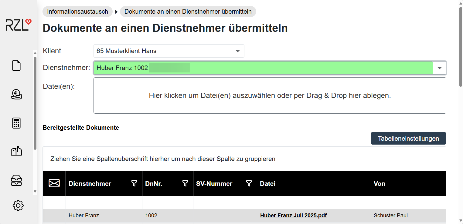 Neben den monatlichen Abrechnungen können auch beliebige Dokumente für einzelne Dienstnehmer auf das RZL Klientenportal hochgeladen werden. Diese Möglichkeit finden Sie im Programmteil Informationsaustausch / Dokumente an einen Dienstnehmer übermitteln.