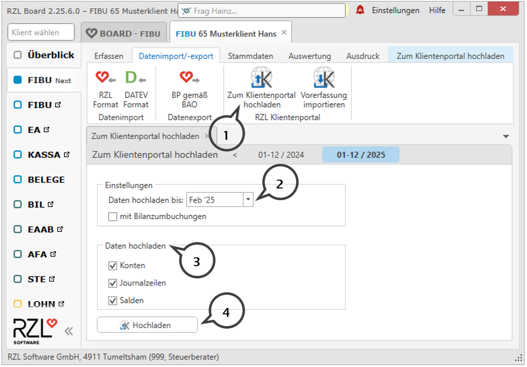 In der FIBU-Next werden die Auswertungen im Programmteil Datenimport/Export / Zum Klientenportal hochladen (1) zur Verfügung gestellt. Sie können im Bereich Einstellungen (2) den Zeitraum einschränken und auswählen ob die Bilanzumbuchungen auch hochgeladen werden sollen. Beim Daten hochladen (3) aktivieren Sie die notwendigen Felder. Durch Anwahl der Schaltfläche Hochladen (4) werden die Auswertungen im Klientenportal zur Verfügung gestellt.