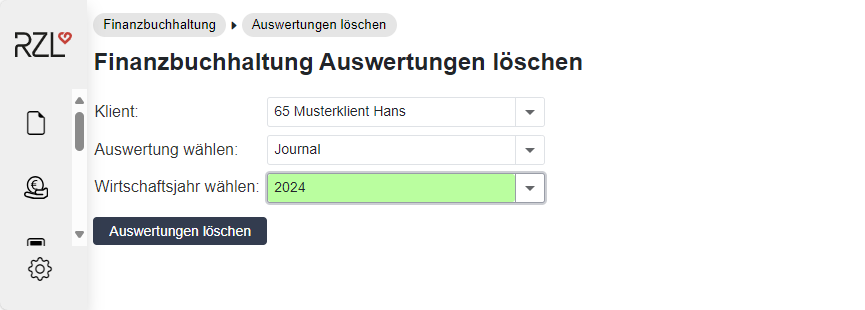 Im Kanzleibereich haben Sie die Möglichkeit, die bereitgestellten Auswertungen je Klient wieder zu löschen. Den Menüteil dazu finden Sie unter Finanzbuchhaltung / Auswertungen löschen.