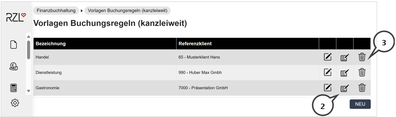Nach Anwahl des Bearbeiten-Symbols (2) öffnet sich der Dialog für die Anlage und Bearbeitung der Verbuchungsregeln. Vorlagen können durch Anwahl des Papierkorb-Symbols (3) gelöscht werden.