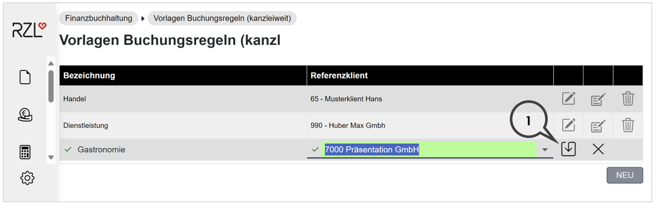 Nach Anwahl der Schaltfläche NEU vergeben Sie eine Bezeichnung für die Vorlage, ordnen einen Referenzklienten zu und speichern (1) die Vorlage ab.
