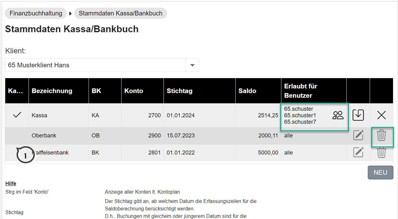 Die Bearbeitung der Benutzer ist bereits im Kap. 5.3 Anlage des Kassa/Bankbuchs im RZL Klientenportal beschrieben. Nach Auswahl des Benutzers muss die Hinterlegung mit dem Speichersymbol gesichert werden.