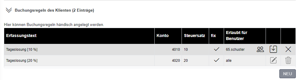 Die Buchungsregeln können auf einzelne beim Klienten angelegte Benutzer eingeschränkt werden.