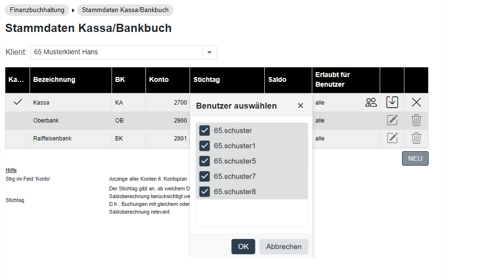 Im abgebildeten Beispiel darf das Kassabuch von den Benutzern 65.schuster, 65.schuster1 und 65.schuster7 bearbeitet werden.