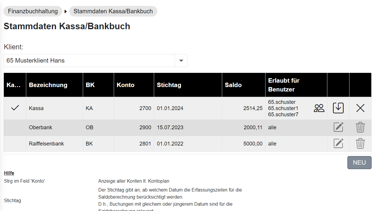 Kassa/Bankbücher werden im Programmteil Finanzbuchhaltung / Stammdaten Kassa/Bankbuch für die einzelnen Klienten angelegt.