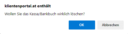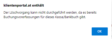 Wenn Sie die oben angezeigte Abfrage mit OK beantworten, wird das jeweilige Kassa/Bankbuch gelöscht. Sind bereits Vorerfassungen vorhanden ist ein Löschen nicht möglich.