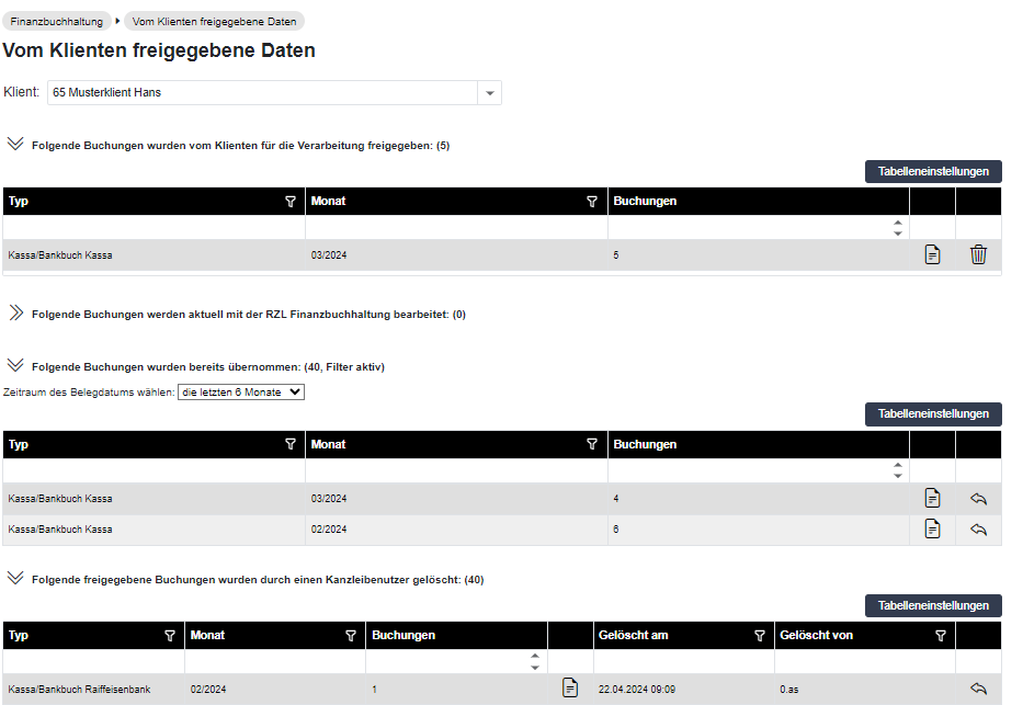 Hier erhalten Sie eine Ansicht jener Buchungen, die der Klient im Klientenbereich erfasst und bereits freigegen hat. Durch Anwahl des Papierkorb-Symbols kann eine Vorerfassung gelöscht werden.