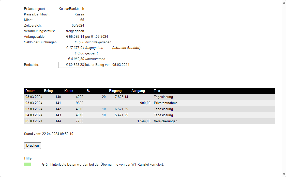 nicht freigegeben: dies ist der Saldo der Buchungen, die vom Klienten noch nicht freigegeben wurden