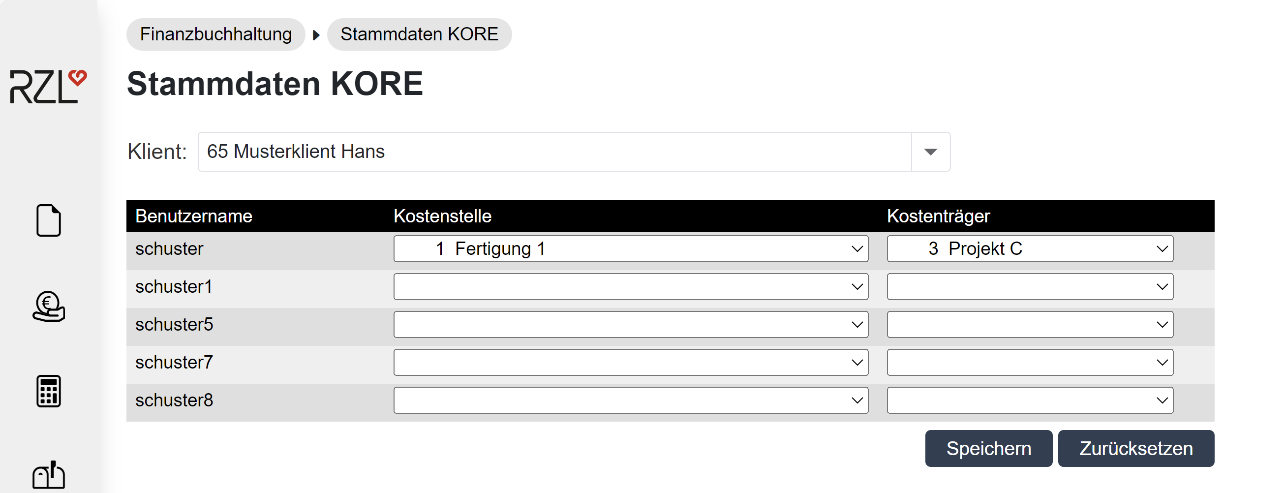 Wenn im Buchhaltungsklienten eine Kostenstellen und/oder eine Kostenträgerrechnung gebucht wird, kann im RZL Klientenportal im Programmteil Finanzbuchhaltung / Stammdaten KORE den Benutzern eine Kostenstelle und ein Kostenträger zugeordnet werden.