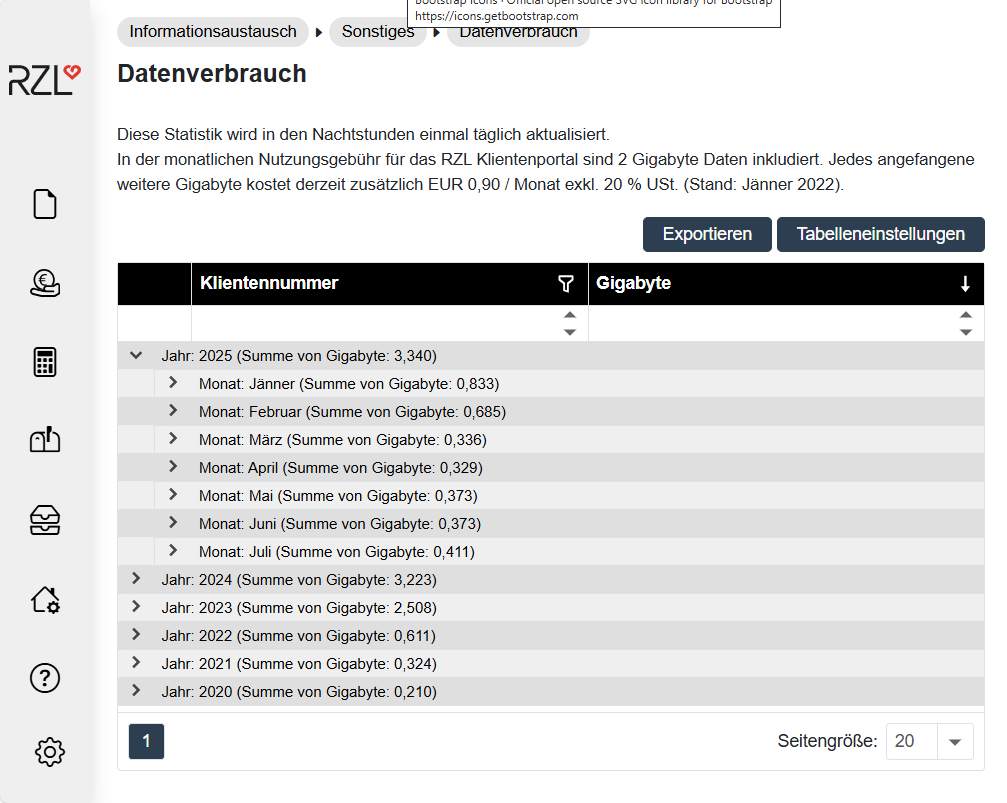Der Programmpunkts Informationsaustausch / Sonstiges bietet die Möglichkeit, Ihren Datenverbrauch aufzurufen. Die Aktualisierung des Datenverbrauchs erfolgt einmal pro Tag. Die Darstellung des Datenverbrauchs erfolgt monatlich getrennt nach Klienten.