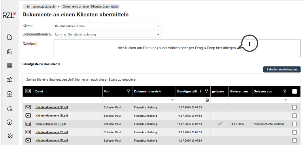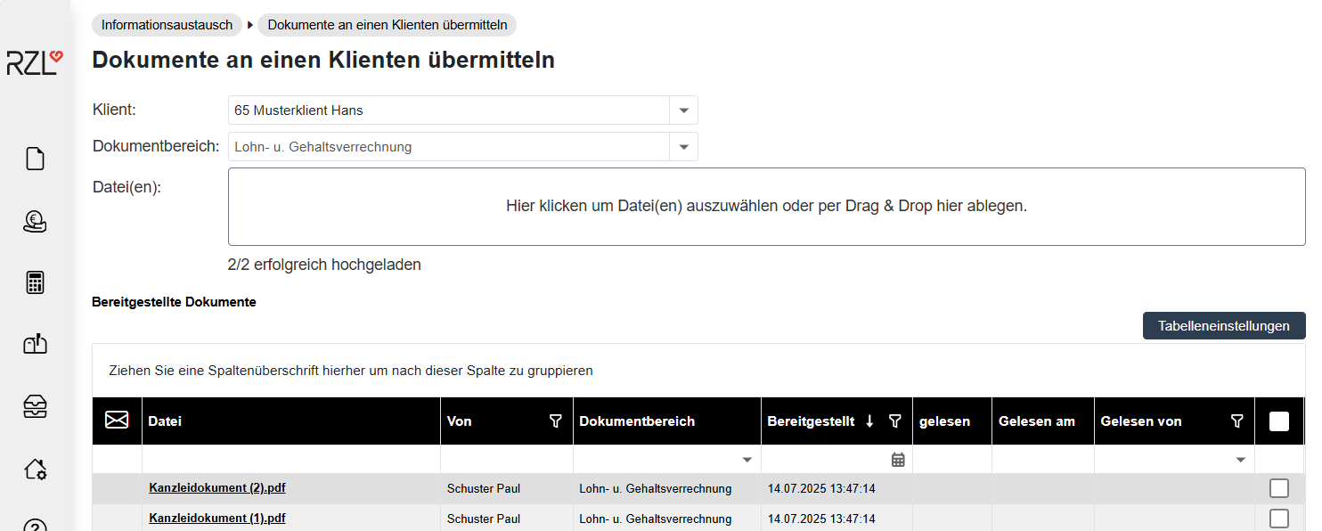 Der Programmteil Informationsaustausch / Dokumente an einen Klienten übermitteln ermöglicht Ihnen das Hochladen von Dokumenten für einzelne im RZL Klientenportal angelegte Klienten.