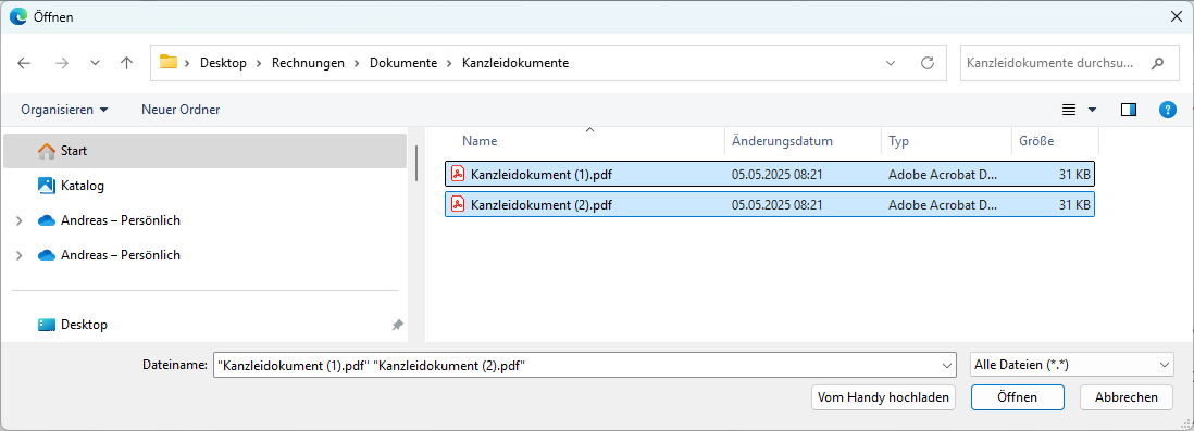 Im Dialogfenster können Sie ein bestimmtes Dokument suchen und auswählen. Durch einen Doppelklick auf das Dokument oder nach Anwahl der Schaltfläche Öffnen wechselt das Programm in den Ausgangsbildschirm zurück und die angewählten Dokumente werden ins Klientenportal hochgeladen.