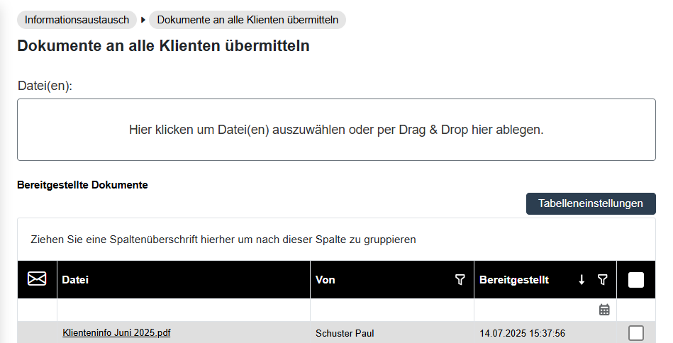 Unter Informationsaustausch / Informationen an alle Klienten übermitteln können Sie Informationen (Dokumente) allen im Klientenportal angelegten Klienten zur Verfügung stellen.