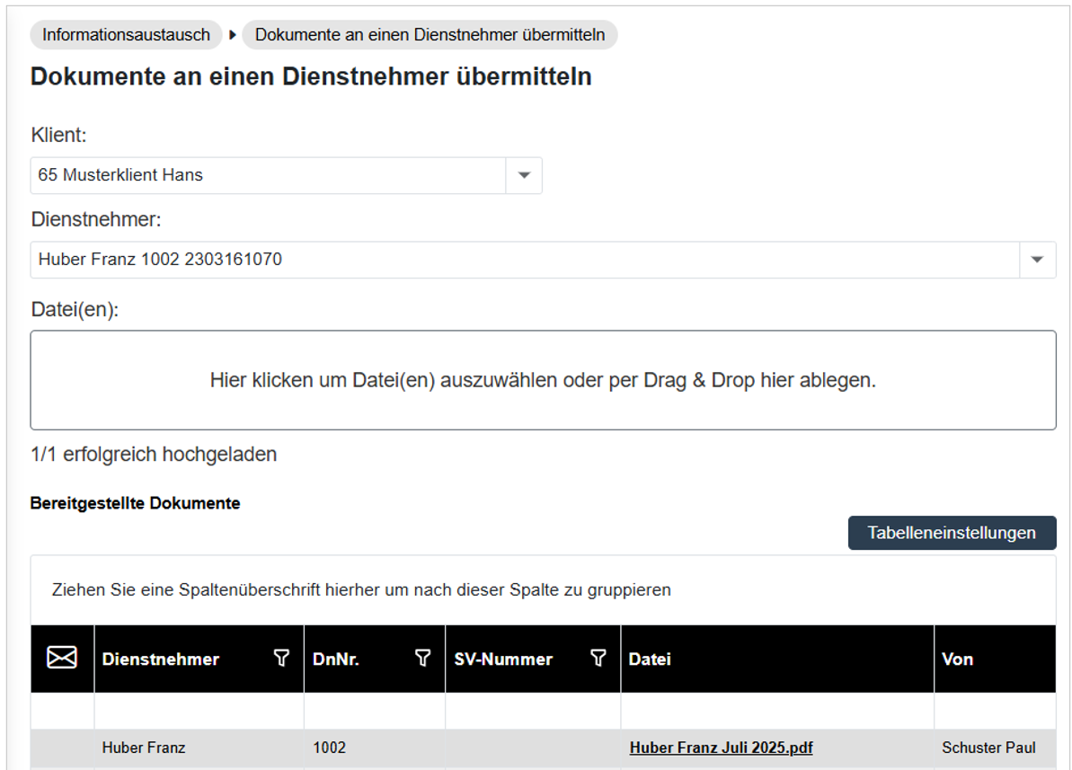 Anschließend wird dem Dienstnehmer das Dokument im Klientenportal zur Verfügung gestellt. Bereitgestellte Dokumente werden im unteren Bereich des Bildschirms angezeigt.