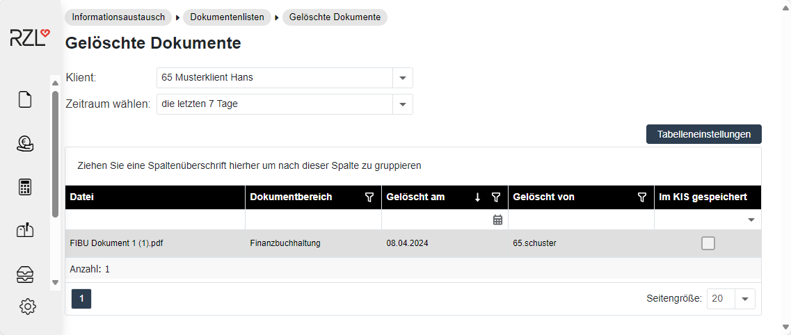 Im Programmteil Informationsaustausch / Dokumentenlisten / Gelöschte Dokumente sehen Sie eine Liste mit den bereits gelöschten Dokumenten.