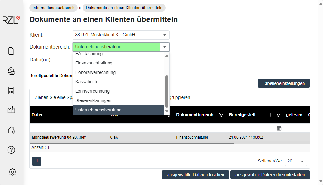 Wählen Sie hier den neu angelegten Dokumentbereich und die gewünschten Klienten aus und bestätigen Sie die Eingabe mit Speichern. Durch diese Auswahl können Sie nun, wenn Sie Dokumente an einen Klienten übermitteln, den neu angelegten Dokumentbereich verwenden.