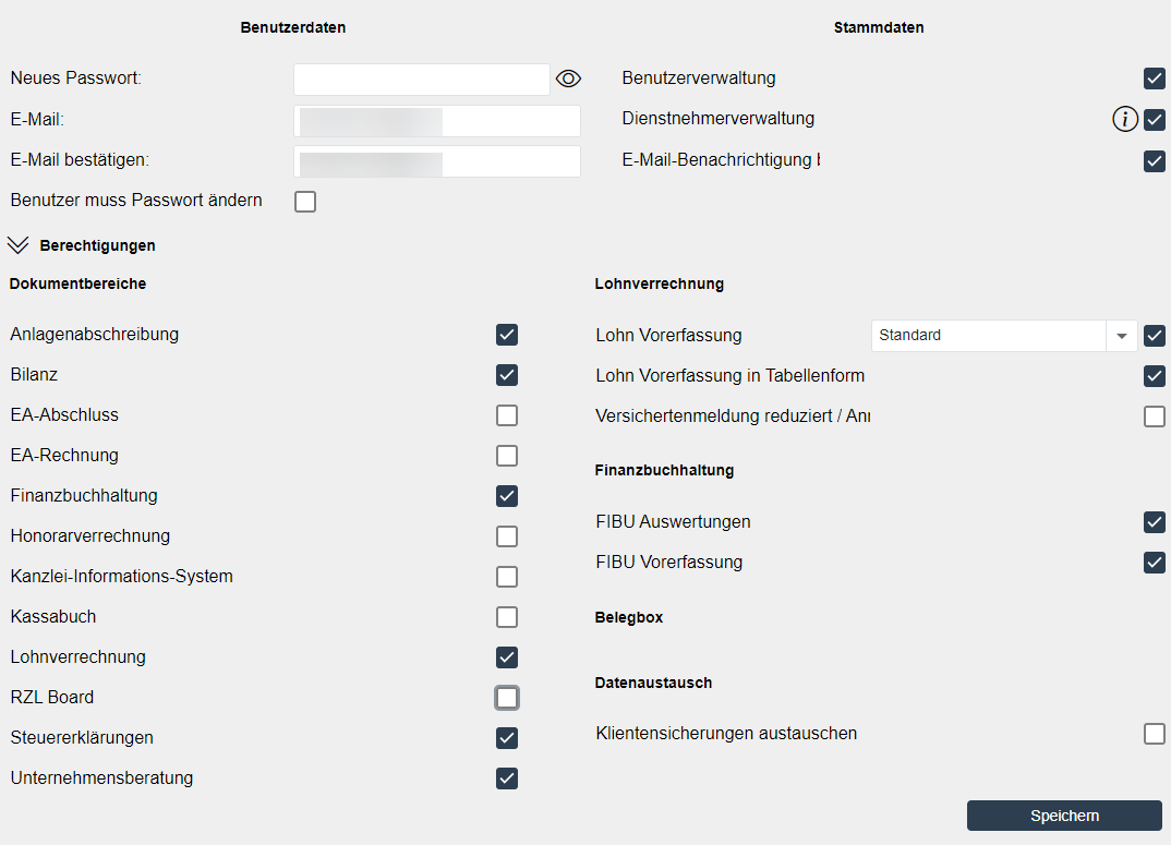 Damit Ihr Klient auch diesen neuen Dokumentbereich verwenden kann, ist dieser in den Benutzerstammdaten des Klienten zu aktivieren. Gehen Sie hierfür unter Stammdaten / Klienten / Klientenstammdaten und wählen Sie die betreffenden Klienten aus. Anschließend sind bei den Berechtigungen die Dokumentbereiche beim gewünschten Benutzer anzuwählen und mit Speichern zu bestätigen.