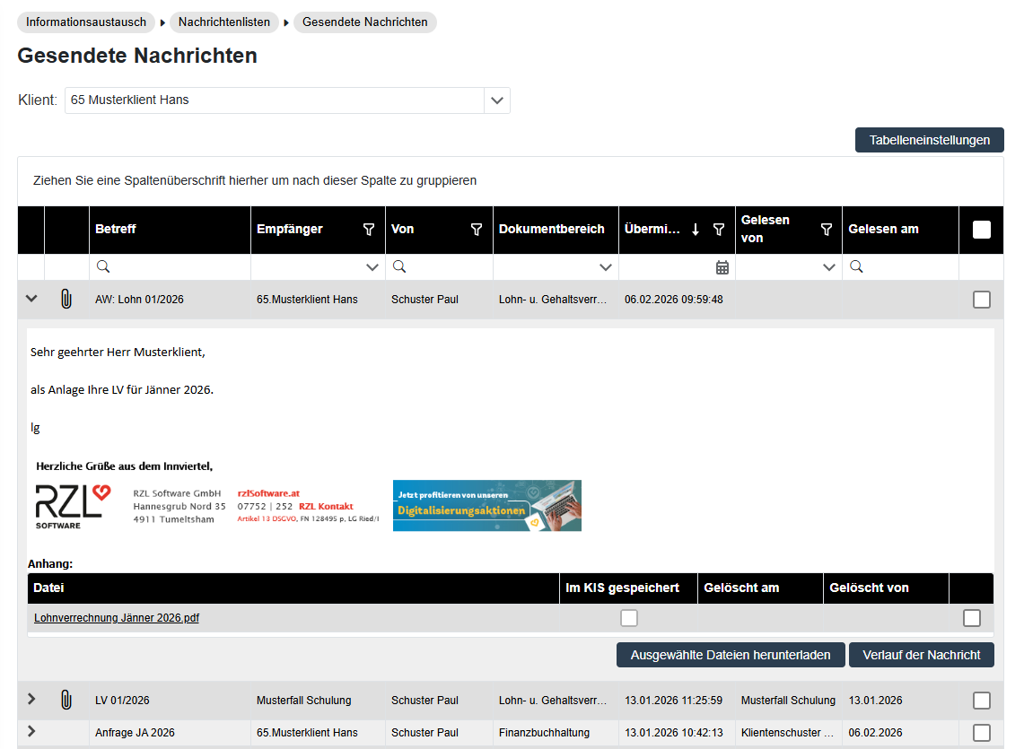 Im Programmteil Informationsaustausch / Nachrichtenlisten / Gesendete Nachrichten kann der eingeloggte Kanzleisachbearbeiter die versendeten Nachrichten einsehen.