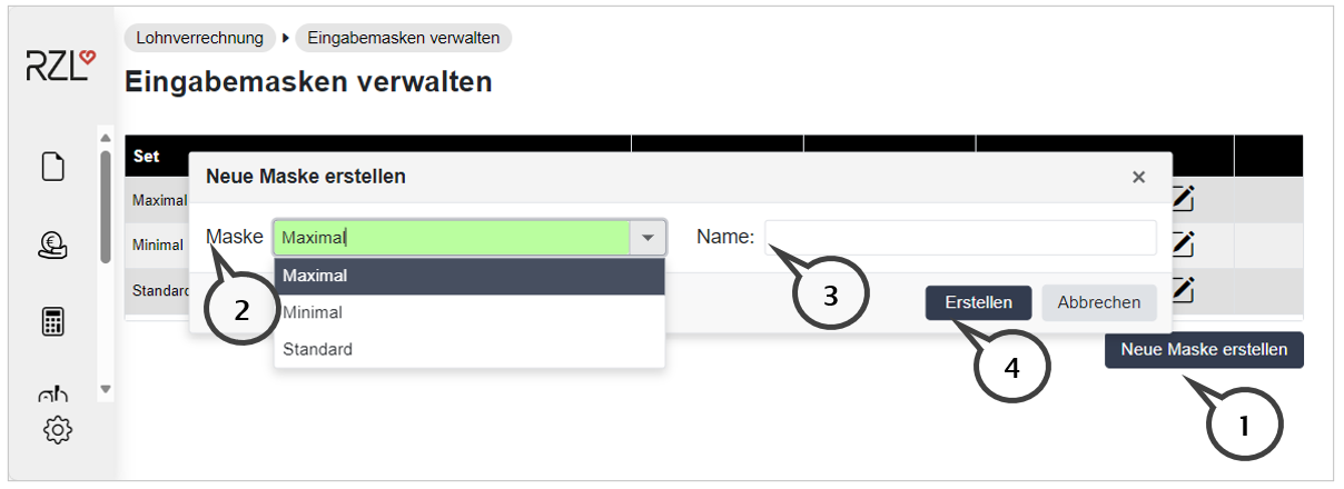 Im Feld Maske (2) wählen Sie den gewünschten Eintrag aus. Vergeben Sie einen Namen (3) für die neue Eingabemaske und klicken Sie auf die Schaltfläche Erstellen (4).
