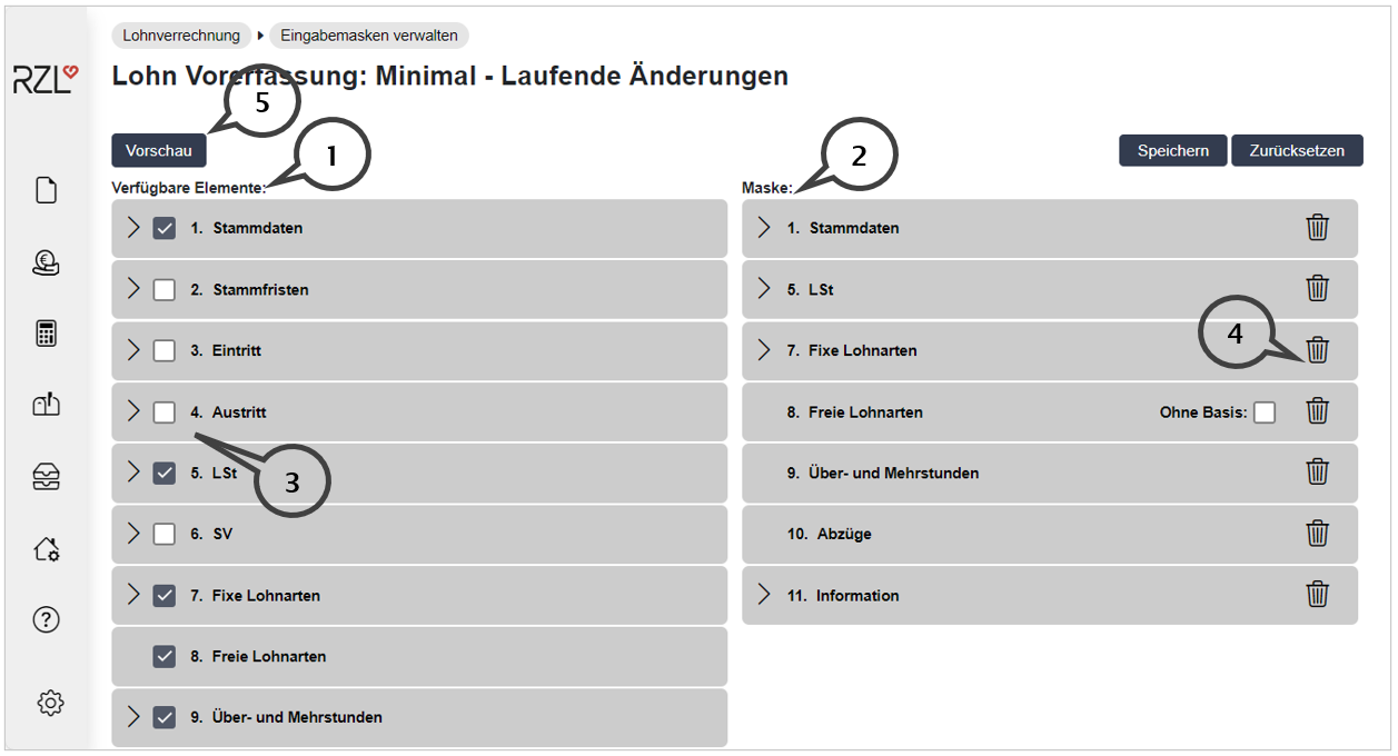 Im rechten Bereich werden die verfügbaren Elemente (1) als Überschriften angezeigt. Diese Bereiche entsprechen den Abrechnungsbildschirmen im Lohnverrechnungsprogramm. Im linken Bereich sehen Sie die Elemente (2), die der Klientenbenutzer in der Eingabemaske verwenden kann. Die Elemente im linken Bereich können durch Drag & Drop nach oben oder unten verschoben werden. In dem Sie ein Hackerl (3) vor die Überschrift setzen, können Sie eine Gruppe aktivieren. Sie können eine Gruppe auch durch Drag & Drop nach rechts verschieben. Die Gruppen können durch Entfernen des Hackerls bei der Überschrift (3), durch Anwahl des Papierkorb-Symbols (4) und durch Drag & Drop wieder deaktiviert und nach rechts verschoben werden. Sie erhalten einen genauen Überblick über die verwendeten Felder durch Anwahl der Schaltfläche Vorschau (5) rechts oben.