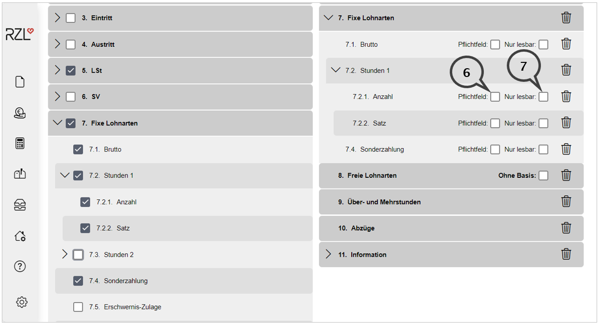 Innerhalb der Gruppen können die Felder wie die Überschriften aktiviert und deaktiviert werden. Im linken Bereich können die Felder mit Drag & Drop nach oben oder unten verschoben werden. Einzelne Datenfelder können als Pflichtfelder (6) oder als Nur lesbar (7) definiert werden. Ein Pflichtfeld muss zwingend ausgefüllt werden. Nur lesbar bedeutet, dass das Feld angezeigt aber nicht bearbeitet werden kann.