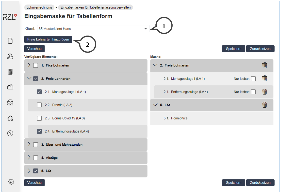 Innerhalb dieser Form der Vorerfassung werden die freien Lohnarten direkt in der Eingabemaske zugeordnet. Die Eingabemaske für die Tabellenerfassung wird für jeden Klienten einzeln angelegt.